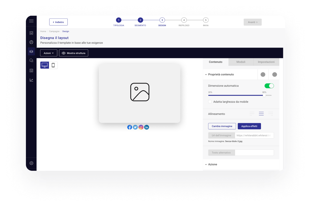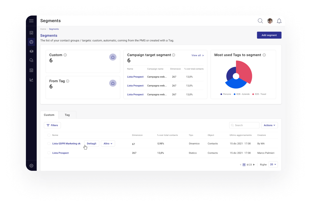 Supera il concetto di lista: con MA puoi segmentare la tua clientela a partire da tutti i dati anagrafici, comportamentali e in base alle preferenze espresse da customer e prospect. La creazione di target mirati porta grandi benefici in termini di reattività ai messaggi e di business.