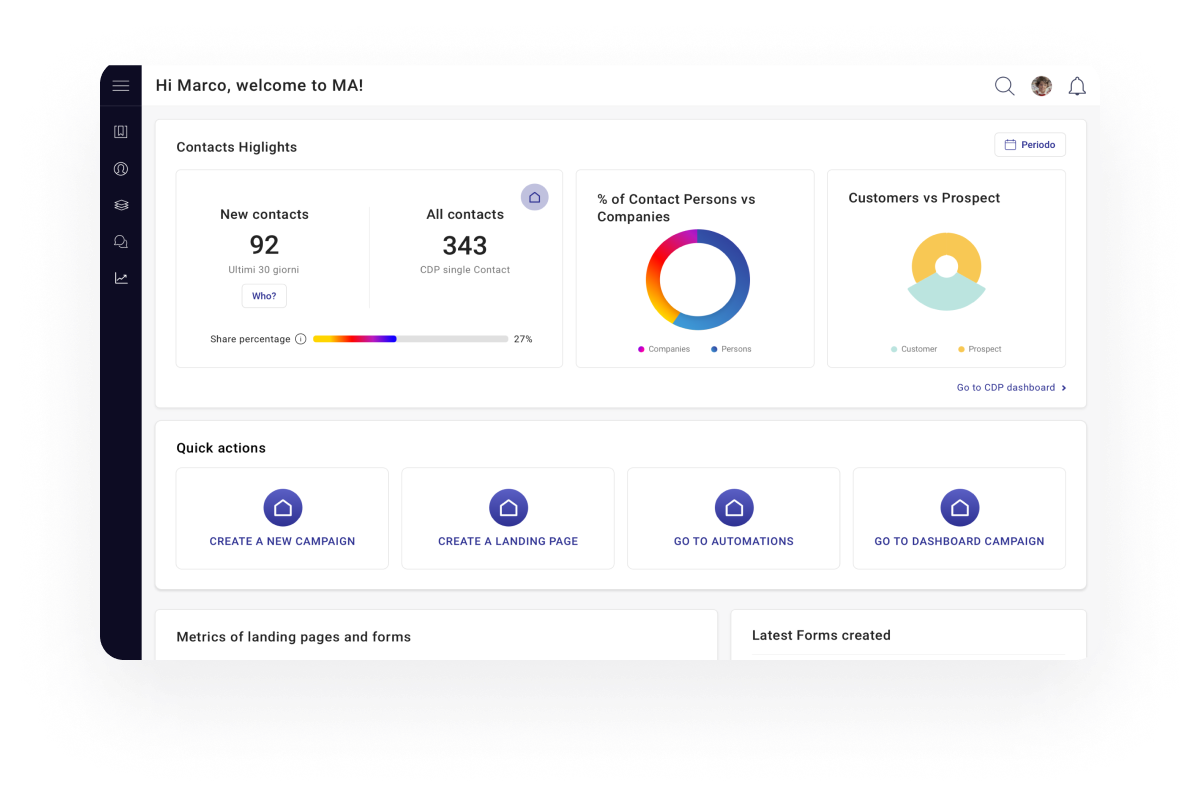 La piattaforma mette a disposizione tutti gli editor (drag&drop) di cui hai bisogno: crea Survey, Landing Page, Form di contatto, mail e molto altro; parti da zero, o sfrutta i tanti template presenti per una strategia di comunicazione sempre personalizzata.