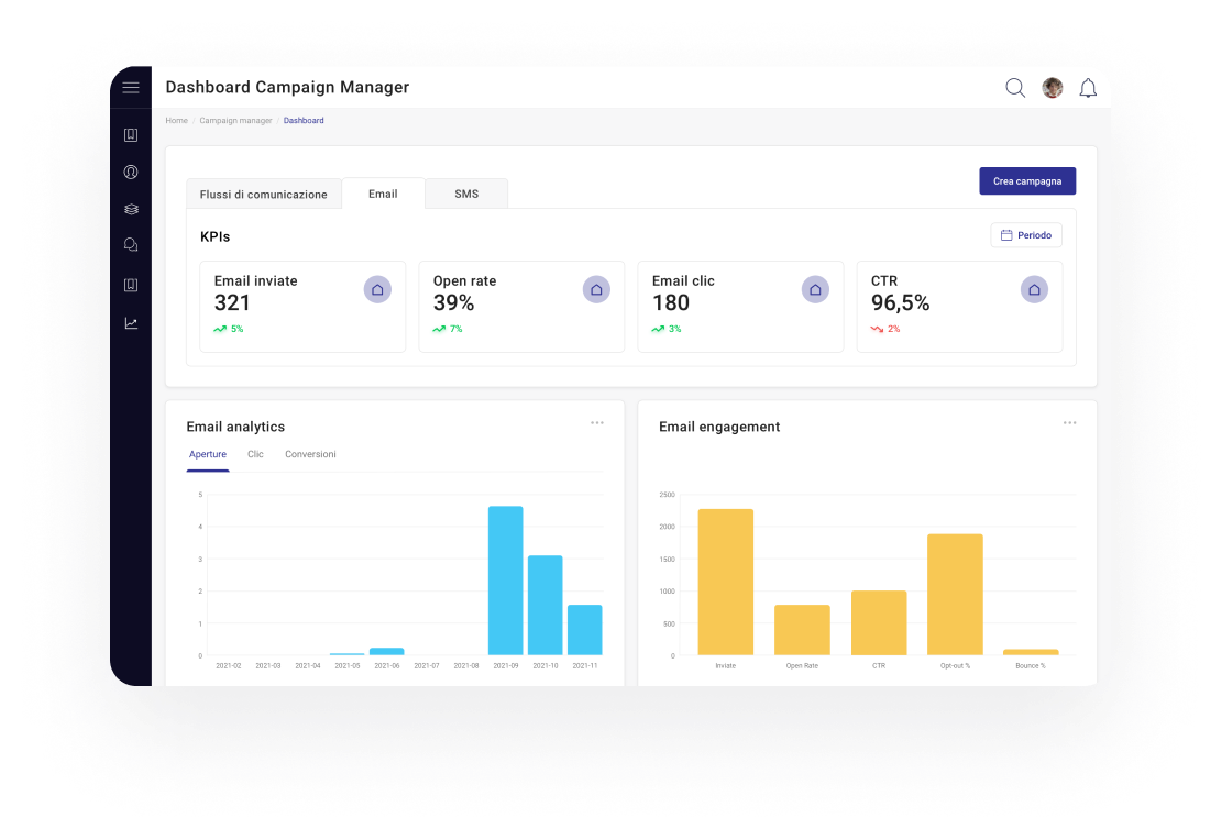 Crea campagne mail personalizzate e sfrutta le diverse opzioni di campagna in base ai tuoi obiettivi di conversione: scegli tra campagne dem, A/B test e gli innovativi Communication Flow (dei veri e propri funnel automatici che sfruttano più asset creati in MA).